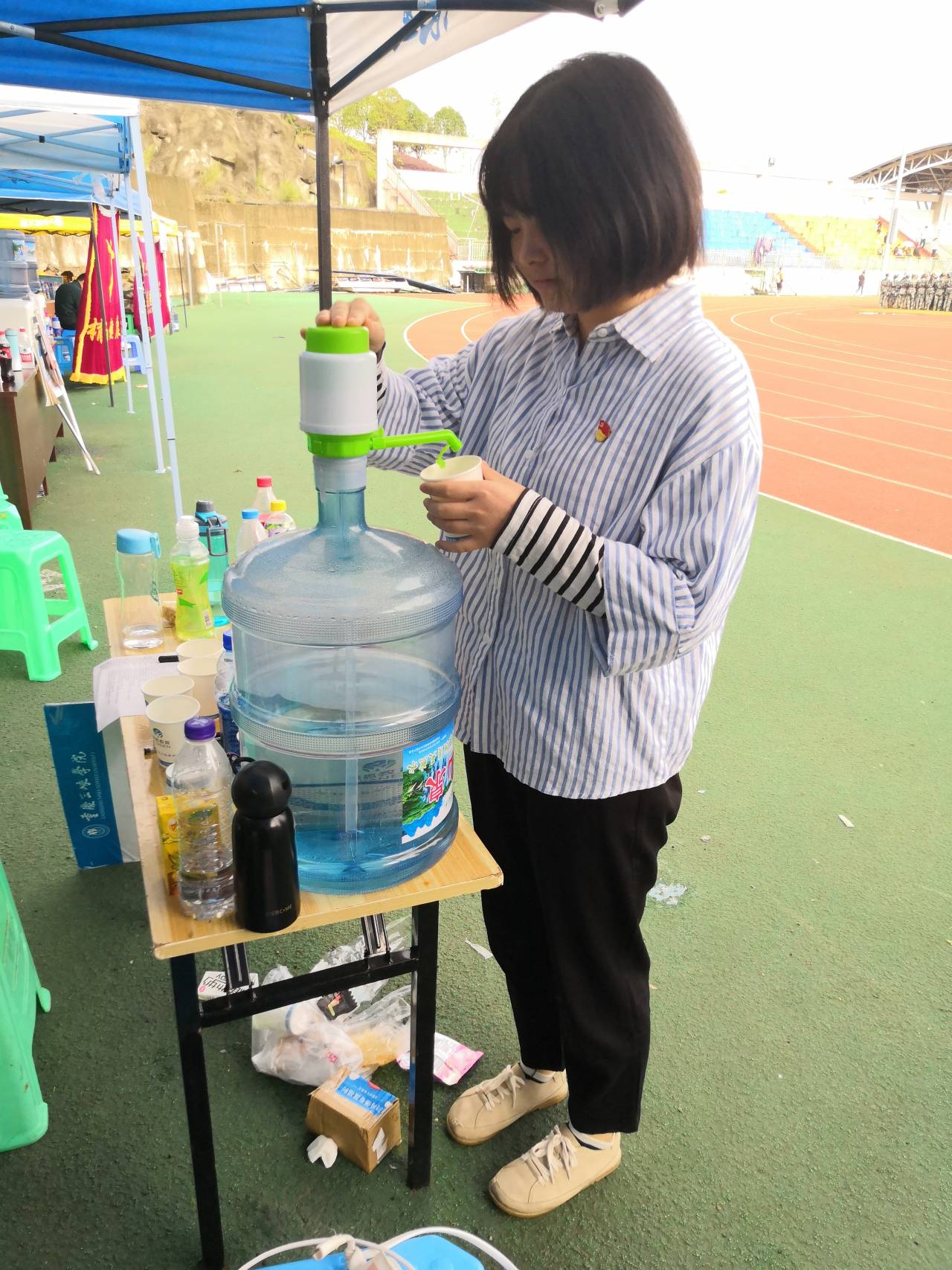 本次志愿活动由陈珍瑶同志负责。首先陈珍瑶同志根据参加本次活动同志的时间表安排值日时间段,一天分两位同志值日,每人值班两轮。在值岗期间,为参加军训的同学提供饮用水,确保每一次休息间隙让大家有水喝,以饱满的精神状态继续参加军训。同志们都积极关心军训同学们的身体状况,岗位上提供有葡萄糖口服液、藿香正气液等药物,以备有同学中暑不适及时提供服务。在闲暇休息之余,同志们都积极耐心的为新生同学解答他们的部分困惑,树立正面形象,提供正能量。鼓励他们在未来的大学时光里,学好专业知识,提高自己的见识修养,树立正确的人生观、价值观、世界观。