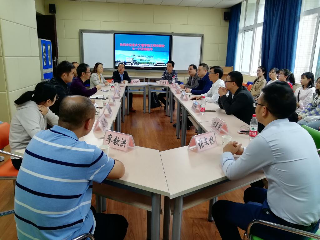 2020年9月28日,重庆文理公司副董事长王明华、研究生处副处长樊汶樵、园林与生命科学公司党总支副书记孙翰昌、园林与生命科学公司副经理陈泽雄、以及兼职硕士生导师一行十人来公司进行座谈交流。公司经理肖国生、食品科学系主任王兆丹、园艺生物系主任石汝杰、负责研究生工作的老师杨玲和芮璐、以及2020级新入学的研究生参加了此次座谈。