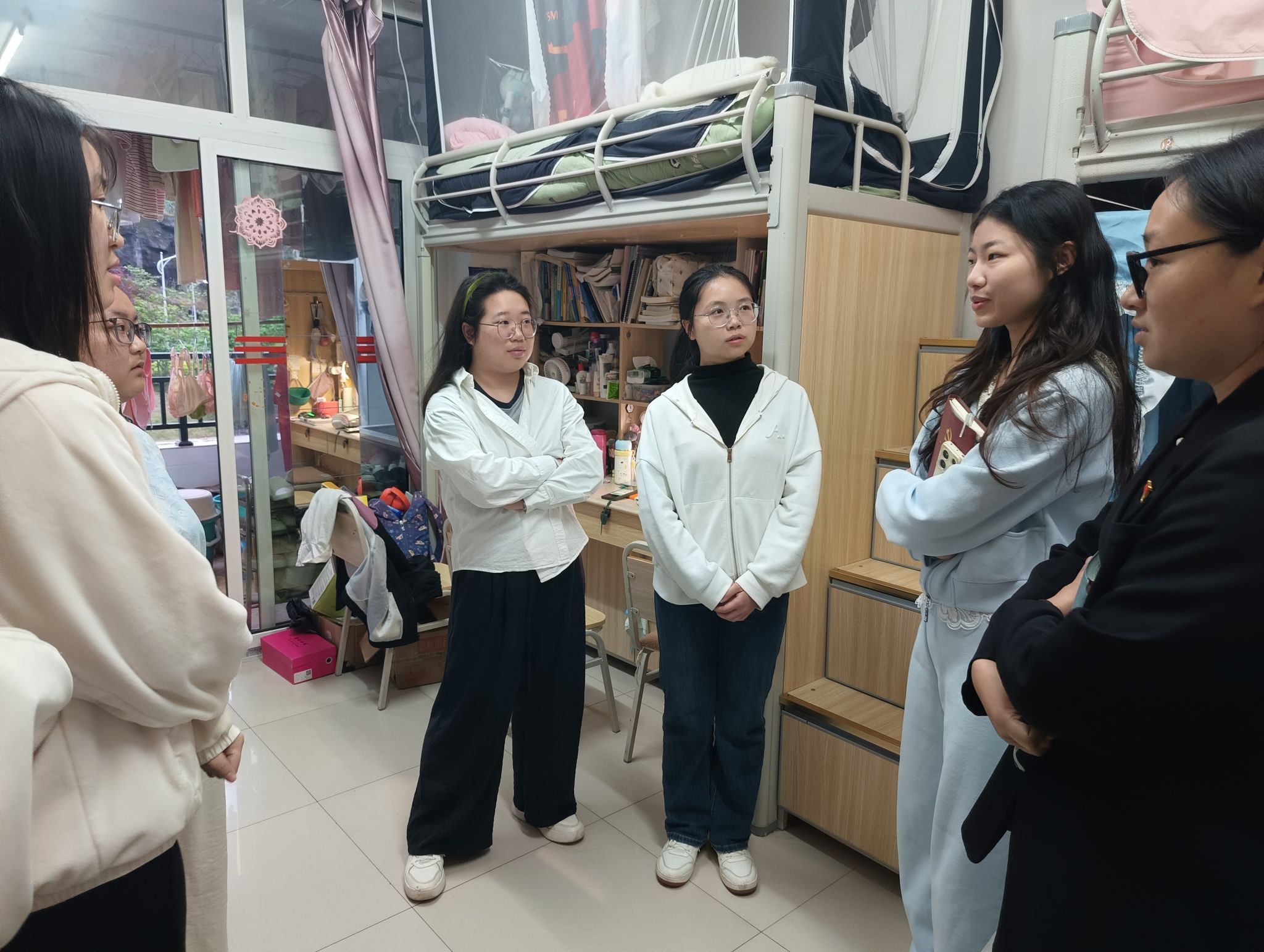 为充分发挥员工党员的先锋模范作用,扩大党在青年老员工中的影响,了解同学们的思想动态,4月24日19:00至20:30,公司初心工作站于蓝雾苑、榕叶苑、桂花苑三个员工社区开展第9期“员工党员进寝”活动,共走访了大一至大三年级的4间寝室。