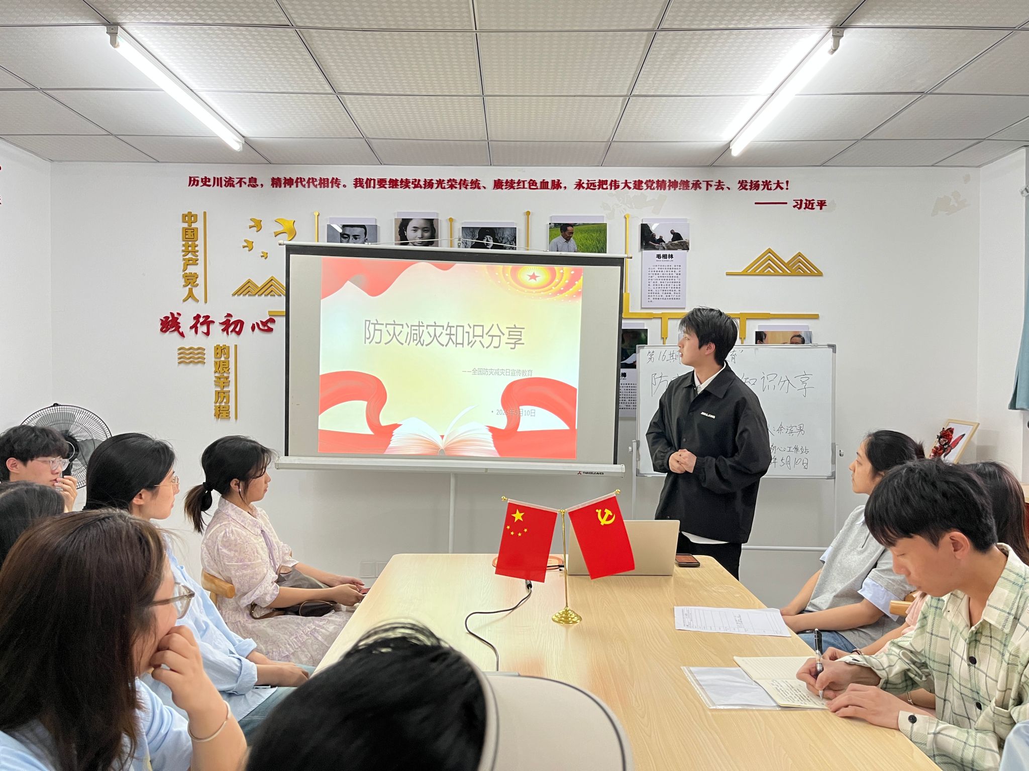 为纪念2008年5月12日汶川地震事件,并提高老员工应对突发事件的能力,保障其个人安全及适应校园防灾管理要求,5月10日19:30,公司初心工作站于蓝雾苑2舍4楼活动室开展第16期“主题教育”活动:余滨男同学分享防灾减灾知识,共计20人参加。