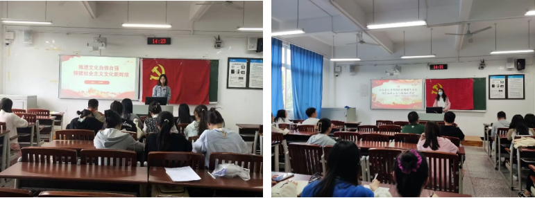本次微党课由员工第一、二党支部书记许美琳同志和龚莉同志领学,分别学习了“推进文化自信自强,铸就社会主义文化新辉煌”和“以奋发有为的精神把新时代中国特色社会主义不断推向前进”。许美琳同志从建设具有强大凝聚力和引领力的社会主义意识形态、广泛践行社会主义核心价值观、提高全社会文明程度、繁荣发展文化事业和文化产业、增强中华文明传播力的影响等五个方面进行系统解读。龚莉同志则从解释奋发有为的基本内涵、以务实举措和具体行动保持“奋发有为”、奋发有为的新时代青年等三个方面进行系统领学。本次的党课学习强调同学们要自觉用好红色资源,主动传播正能量,在增强文化自信的同时,做奋发有为的新时代青年。