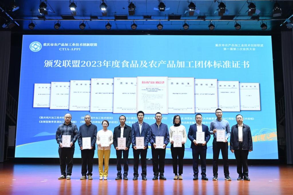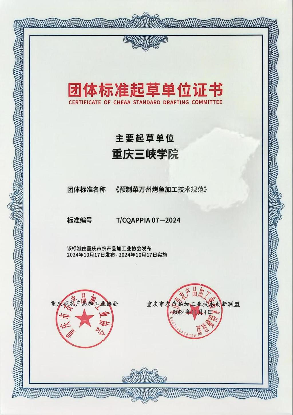 11月4日,重庆市农产品加工业技术创新联盟第一届第二次会员大会召开。会议上,重庆市农产品加工技术创新联盟为公司牵头制定的《预制菜万州烤鱼加工技术规范》团体标准颁发了证书。
