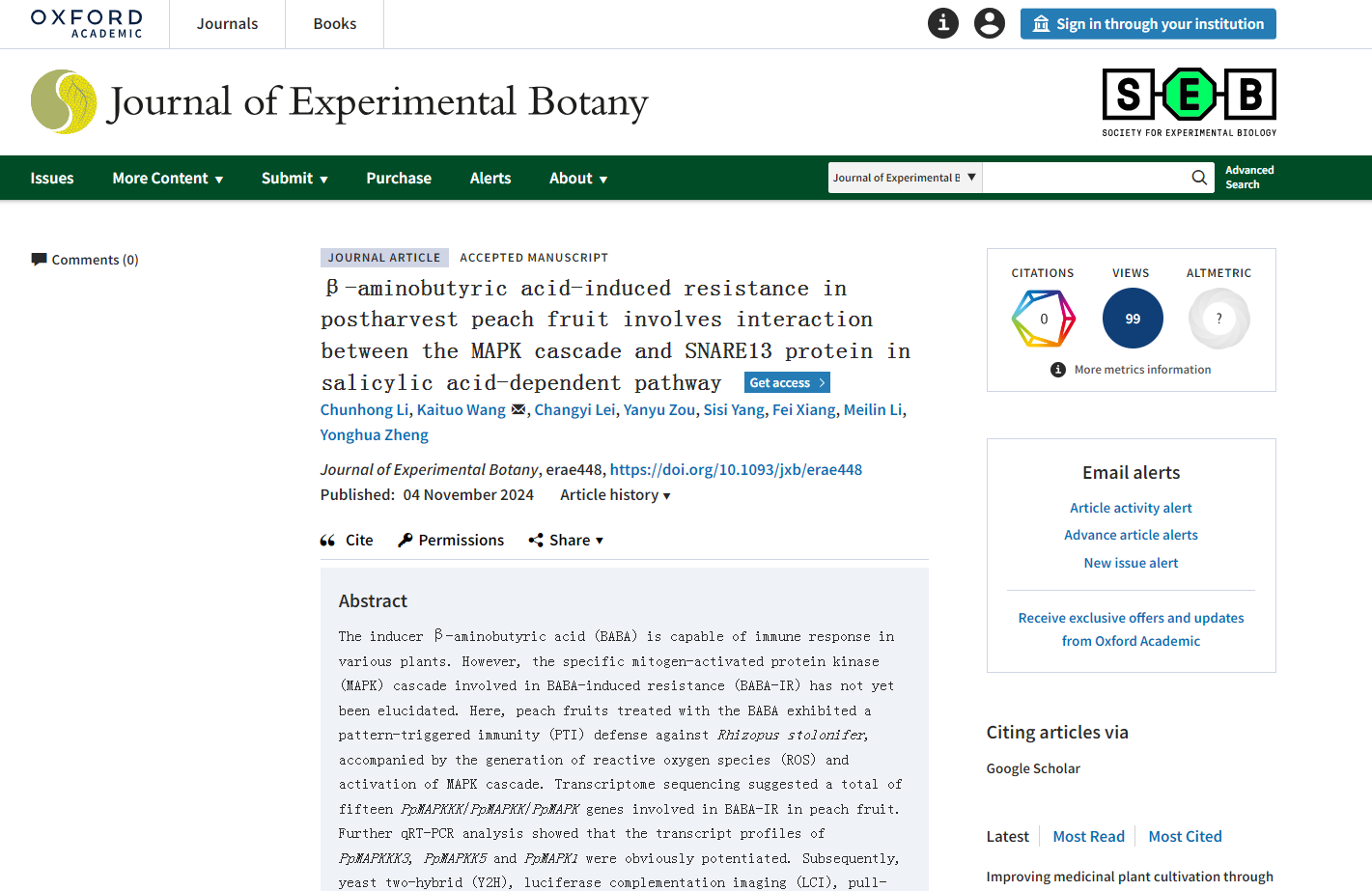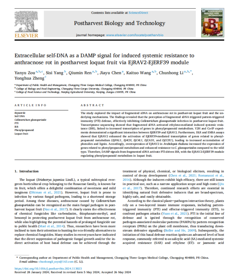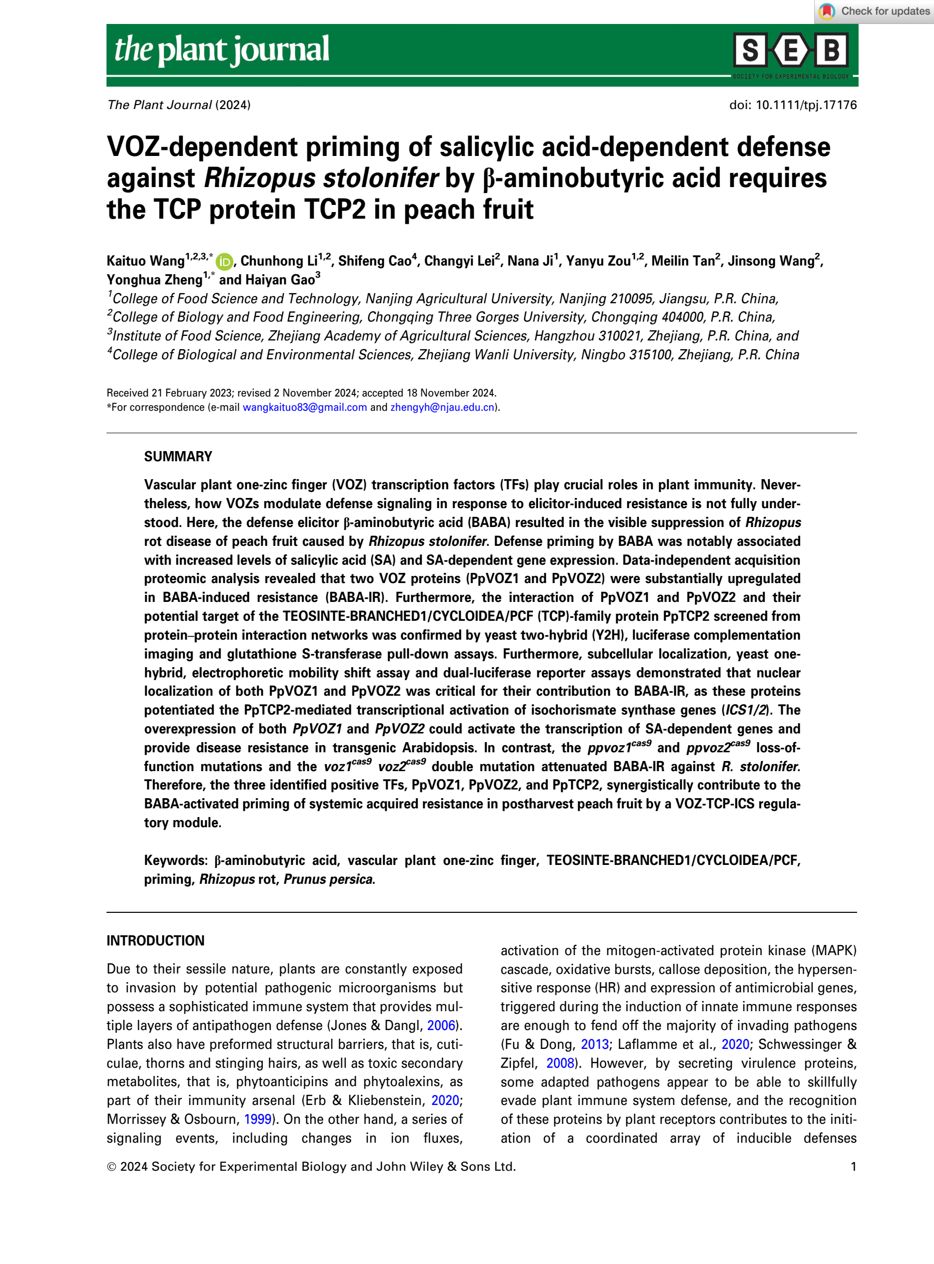 近日,365英国上市集团教师在植物学经典期刊《The Plant Journal》和《Journal of Experimental Botany》和采后生物学期刊《Postharvest Biology and Technology》上分别发表了三篇重要论文。首篇《VOZ-dependent priming of salicylic acid-dependent defense against Rhizopus stolonifer byβ-aminobutyric acid requires the TCP protein TCP2 in peach fruit》由汪开拓作为第一兼通讯作者,联合南京农业大学郑永华团队,发现维管植物单锌指转录因子(VOZ1和VOZ2)通过调控TCP2和ICS基因,显著增强了桃果对Rhizopus stolonifer的抗病能力;次篇《β-aminobutyric acid-induced resistance in postharvest peach fruit involves interaction between the MAPK cascade and SNARE13 protein in salicylic acid-dependent pathway》由三峡医专黎春红作为第一作者,汪开拓为通讯作者,阐明了诱导剂β-氨基丁酸(BABA)在桃果中激活的MAPK级联反应及其下游因子SNARE13在提升水杨酸依赖防御中的关键作用;第三篇《Extracellular self-DNA as a DAMP signal for induced systemic resistance to anthracnose rot in postharvest loquat fruit via EjRAV2-EjERF39 module》由已毕业本科生邹燕羽为第一作者,系统揭示自源性DNA诱导对枇杷果实抗性反应中的诱导作用。这三项成果为植物免疫机制和抗病育种提供了新的科学依据,推动了农业可持续发展的研究进展。
