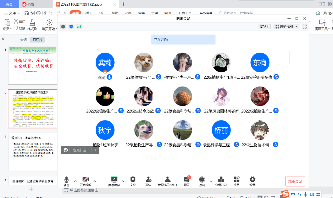 2022年11月6日,公司辅导员分年级开展线上疫情防控、反诈骗、安全教育、法制教育专题周末教育,公司全体员工参与。