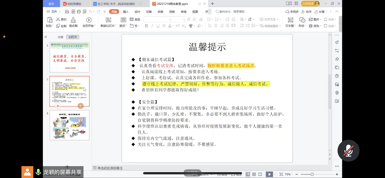 会上,辅导员首先提出诚信考试,鼓励同学们积极备战期末考试,强调遵守考试纪律的重要性,让大家充分认识到诚信的的重要性,养成良好的行为习惯。其次,辅导员强调疫情防控和个人安全,提醒同学们做好个人卫生、防护病毒、积极锻炼。最后,辅导员建议同学们在假期间积极参加社会实践,努力提升自我、磨练自我。