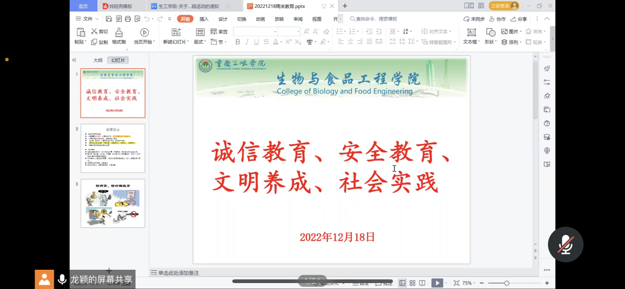 12月18日下午,公司辅导员熊小飞、许美琳、龙颖、龚莉分年级线上开展诚信教育、安全教育、文明养成、社会实践专题周末教育,公司全体员工参加。