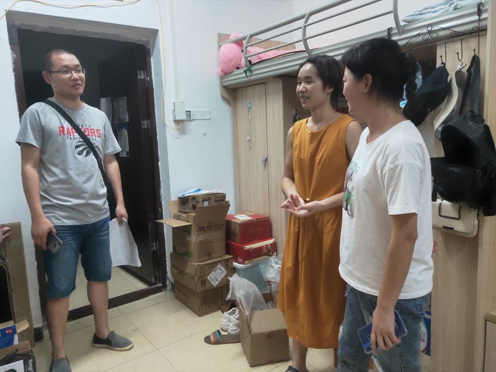 8月2日晚上21:30,365英国上市集团学工办主任李华林、辅导员蒋园园走访暑假留校员工寝室,了解同学们暑期在校学习、生活等状况,并针对问题给予关心、帮助和指导。