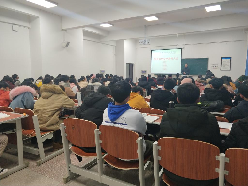 大会开始,老师首先谈到冬季严寒天气对同学们学习、生活的影响,提醒同学们做好相关防护措施,在保证身心健康的基础上才更好的学习。随后,通过具体事例阐述了冬季存在的安全隐患,从寝室用电安全、交通安全、饮食安全、遵纪守法、心理健康等问题着手,嘱咐同学们一定要树立安全防护意识,杜绝安全隐患,切实保护好自身安全。最后,提醒同学们珍惜时光,临近期末更把握好时间,不断查漏补缺,为最后的冲刺做好准备。