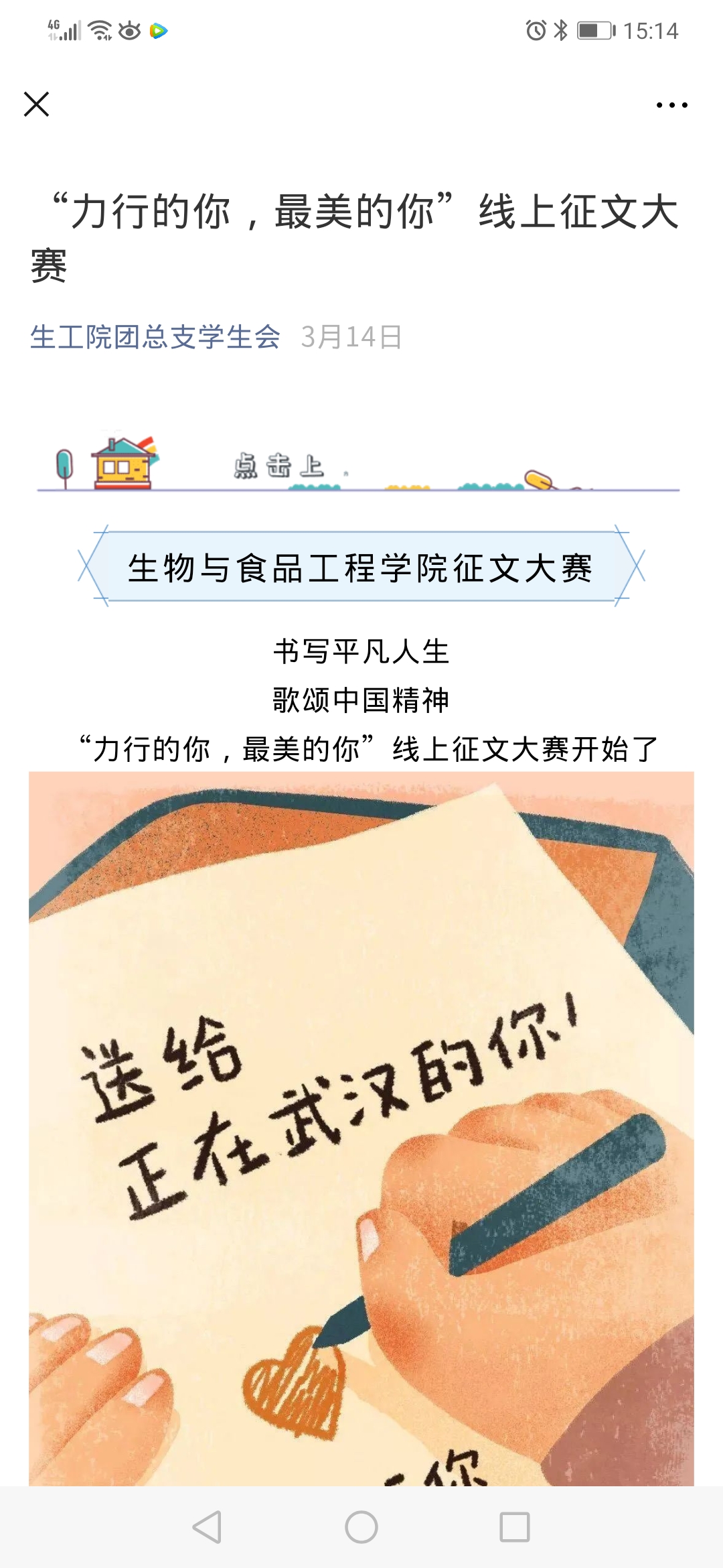 3月14日-4月5日,公司开展以“力行的你,最美的你”为主题的线上征文大赛,公司同学积极投稿,书写优美文章,赞扬高尚品格。本次活动旨在以征文方式让同学们铭记这个特殊的春节,讴歌人间大爱,弘扬奉献精神。