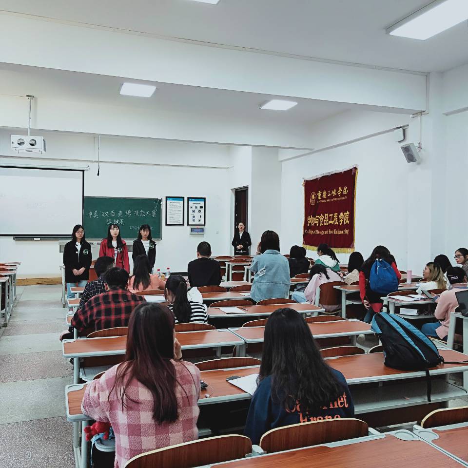 本次比赛在两个教室同时进行,每个教室两名评委,最终成绩选取两名评委的平均分。比赛分为三个环节:开心辞典、情景再现、主题演讲,第一环节占总分的10%,现场播放音频,考验选手的听力能力;第二环节占总分的40%,选手将指定的视频表演出来,考验选手的语言能力以及表演能力;第三环节是主题演讲,占比50%,由主办方选定主题,三位选手协作共同演讲,考验团队协作能力。